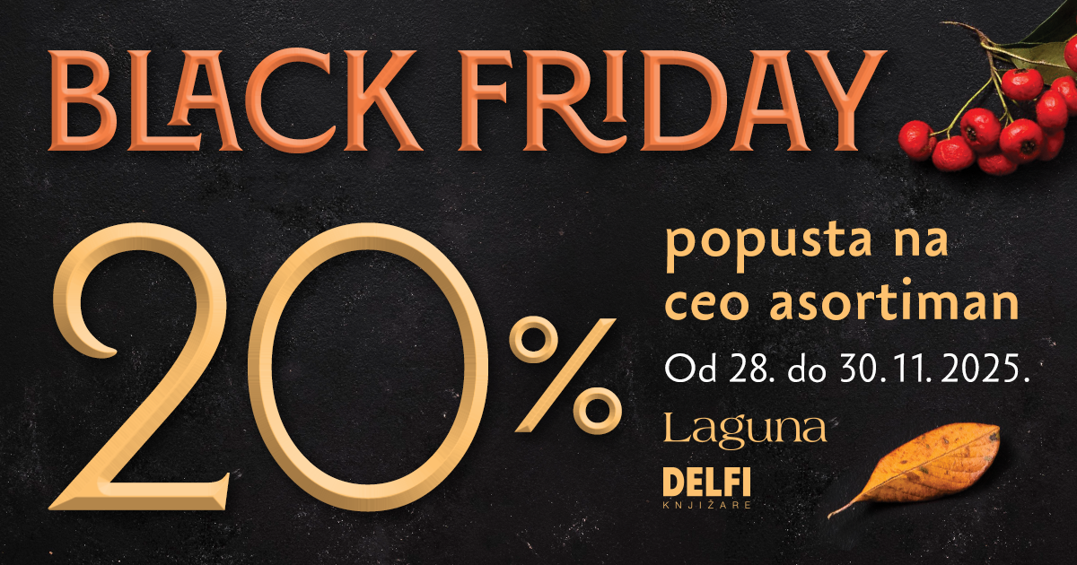 Od 28. do 30. novembra 2025. „Black Friday“ obeležićemo sniženjem od 20% na knjige u izdanju Lagune, celokupan gift program i naslove stranih izdavača. Akcija će se održati ne samo u svim Delfi knjižarama već i na sajtovima laguna.rs i delfi.rs.