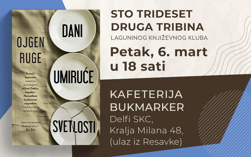 Roman nemačkog pisca Ojgena Rugea „Dani umiruće svetlosti“ tema je martovske tribine Laguninog književnog kluba, 132. po redu, koja će biti održana u petak 6. marta od 18 sati u knjižari Delfi SKC.