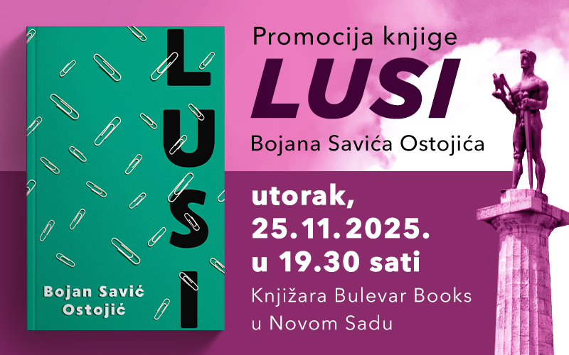 Roman „Lusi Bojana Savića Ostojića (Laguna, 2025) imaće prvu novosadsku promociju u knjižari Bulevar Books (Bulevar Mihajla Pupina 6) u utorak 25. novembra 2025. od 19.30.