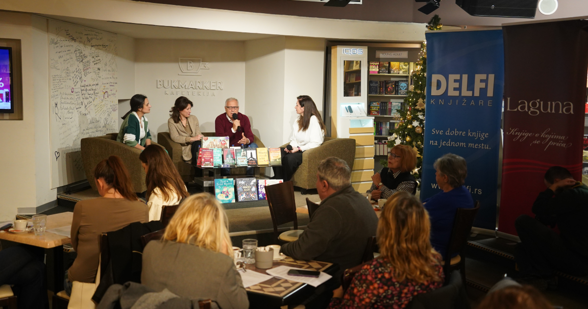 Vanja Bulić, pisac, Ivana Mislirlić, urednica u Laguni, i Milica Duždević, menadžer za razvoj i promociju Delfi knjižara i brenda.
