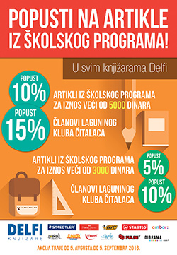 U periodu od 5. avgusta do 5. septembra, prilikom kupovine artikala iz školskog programa u svim knjižarama Delfi možete ostvariti popust od 5 do 15 odsto.