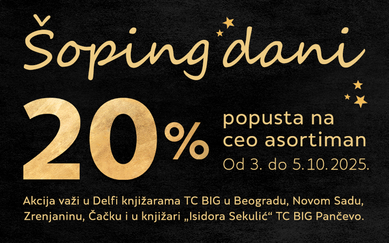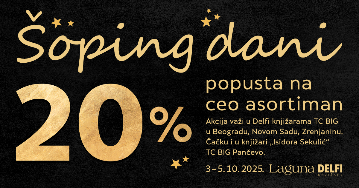 Predstojećeg vikenda od 3. do 5. oktobra 2025. godine očekuje vas popust od 20% na celokupan asortiman u Delfi knjižarama i Laguninim klubovima čitalaca u BIG tržnim centrima u Pančevu, Zrenjaninu Novom Sadu, Čačku i Beogradu.