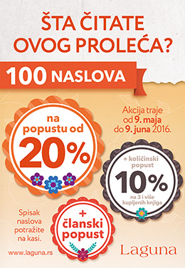 U novoj velikoj akciji u svim Laguninim klubovima čitalaca od 9. maja do 24. juna 2016. godine možete iskoristiti specijalan popust od 20% prilikom kupovine 100 sjajnih naslova. Na ovoj akciji važe članski i količinski popusti. Akcija „Šta čitate ovog proleća?“ važiće i na sajtu www.laguna.rs.