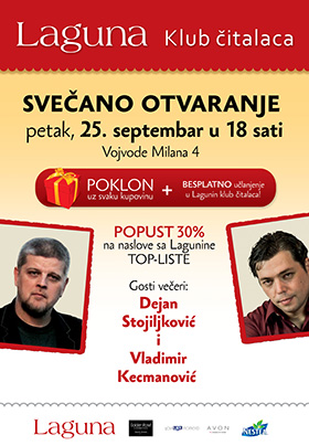 Čast da se zvanično najavi početak rada ove knjižare pripala je Laguninim piscima bestselera Dejanu Stojiljkoviću i Vladimiru Kecmanoviću, koji će tom prilikom potpisivati svoje knjige.