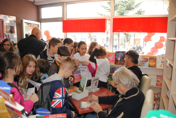 Obećanje je ispunjeno već svečanim otvaranjem kada su se sa decom družili njihovi omiljeni pisci Ljubivoje Ršumović i Uroš Petrović, koji su potpisivali svoje knjige i fotografisali se sa školarcima. Ršumović je podsetio da je prvi ministar prosvete Dositej Obradović rekao: „Knjige, knjige, braćo moja, a ne zvona i praporci.“ On je istakao da moramo imati knjižare i voleti knjige kako bismo negovali srpski jezik i očuvali mitski ritualni čin čitanja.