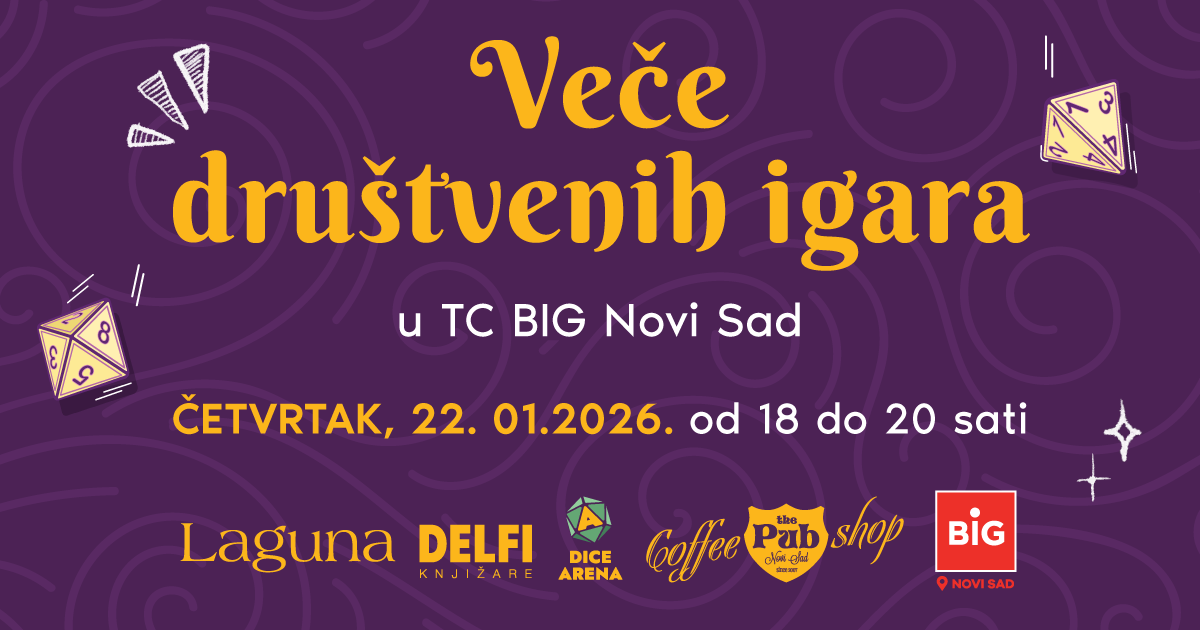 The Pub Coffee Shop i Delfi knjižara u TC BIG Novi Sad udružuju snage i pozivaju vas na veče društvenih igara, koje će se održati 22. januara 2026, u prijatnoj atmosferi kafea od 18 do 20 časova.
